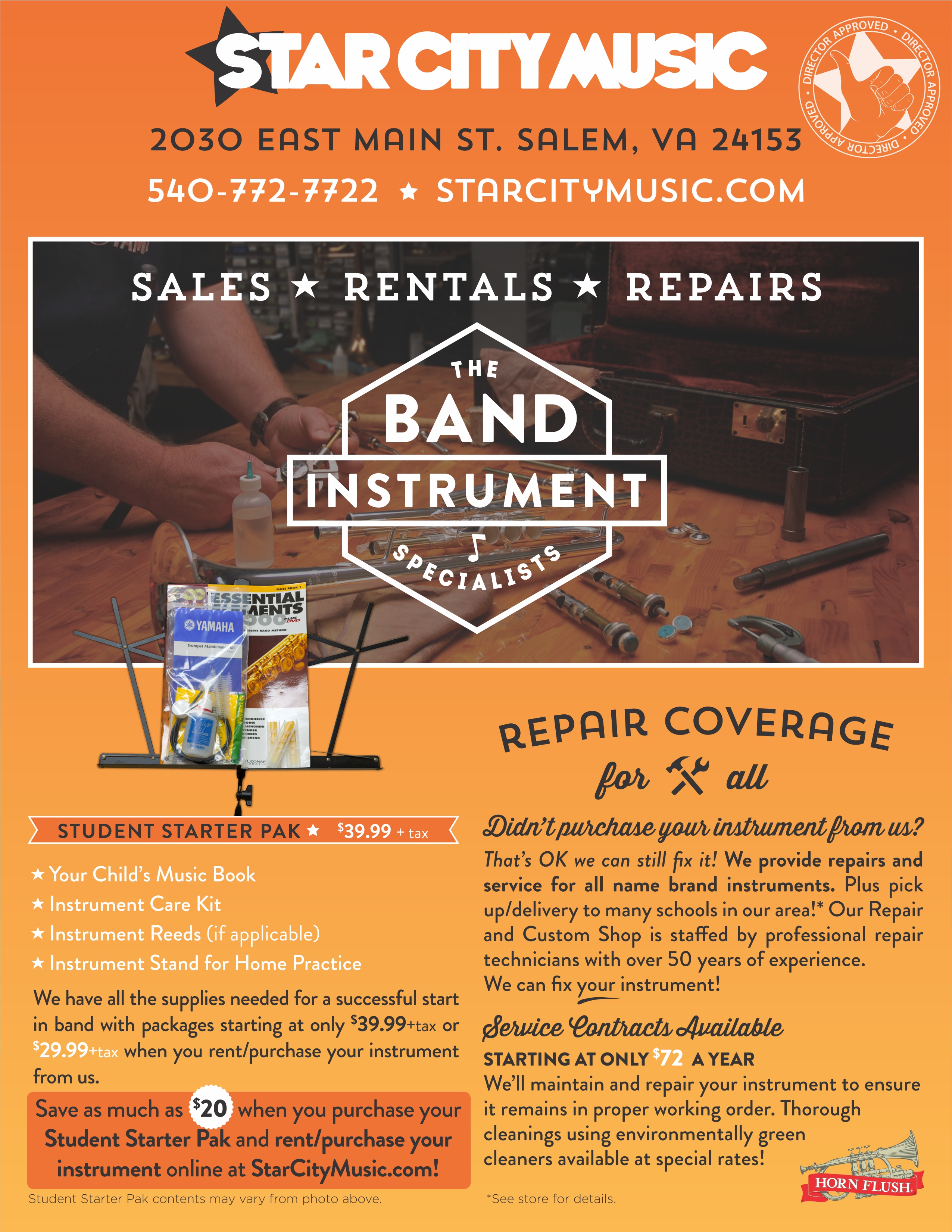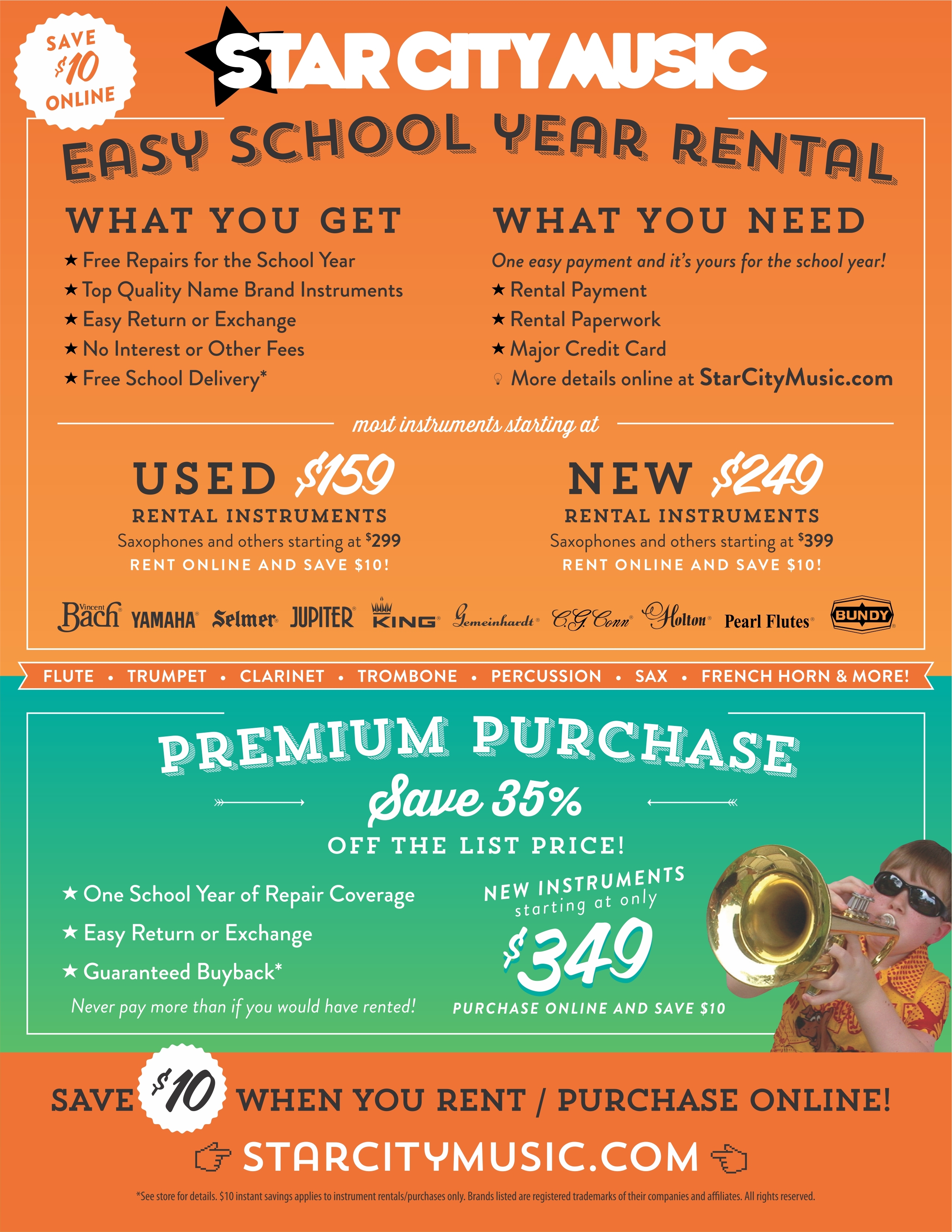 Flutes, Clarinets, Trumpets, Trombones and school percussion kits all for a great low fee of $159 for the school year. What do you get for that? An excellent instrument that has been serviced and ready for the upcoming school year, complete with a case and mouthpiece. All rental instruments from Star City Music come with our incredible repair and replacement coverage. Anything that happens to your instrument is covered at no charge to you. That’s correct, FREE repairs. Don’t forget to check out our Student Starter Pack, it has everything you need to get started in band.